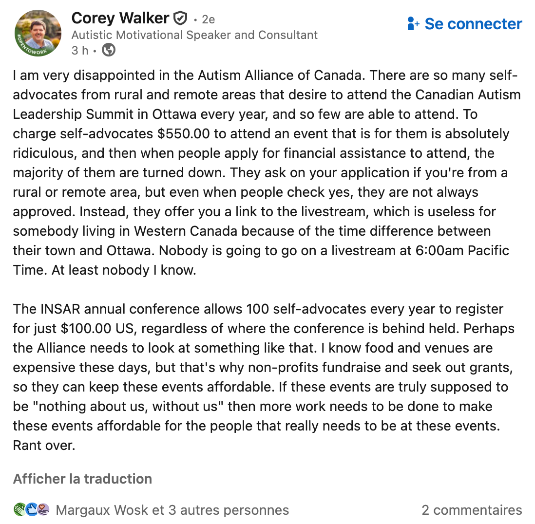 « Je suis très déçu par l’Alliance canadienne de l’autisme. Il y a tellement de personnes issues de milieux ruraux et éloignés qui souhaitent participer au Sommet canadien du leadership en autisme à Ottawa chaque année, mais très peu d’entre elles peuvent y assister.