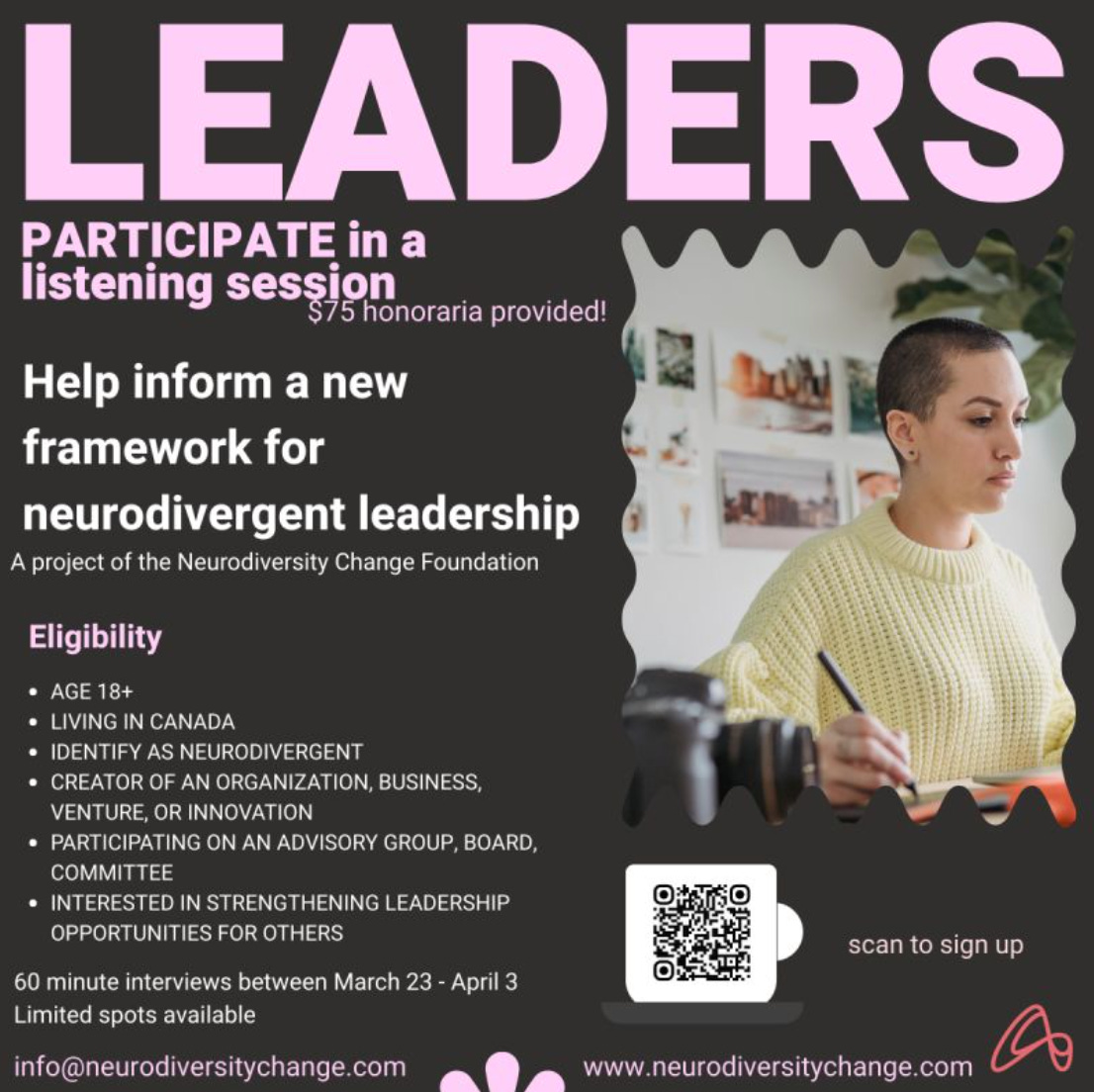 Afin d’éclairer ce travail, nous invitons les leaders neurodivergent·es du Canada à participer à une entrevue de 60 minutes.
