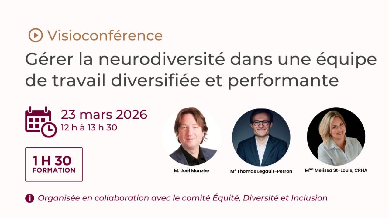 Un panel expert issu des neurosciences, des ressources humaines et du droit présentera les principaux concepts associés à la neurodiversité, ses nombreux bienfaits et quelques bonnes pratiques de gestion qui permettront à chaque membre des équipes juridiques de mieux trouver sa place et de mettre en action son plein potentiel au bénéfice d’une clientèle de plus en plus diversifiée.