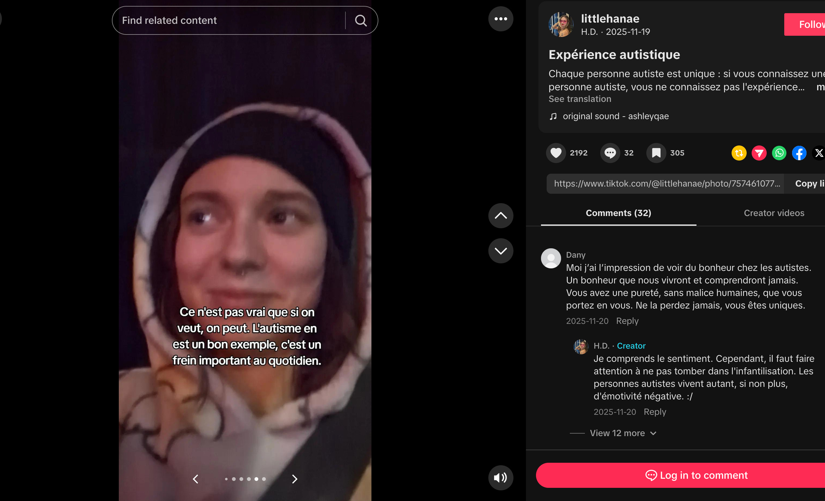 Ayant amassé plus de 16 000 abonné⸱es TikTok et développé plusieurs outils psychoéducatifs, elle partage tout ce qu’elle apprend sur l’autisme au fur et à mesure qu’elle absorbe le contenu.