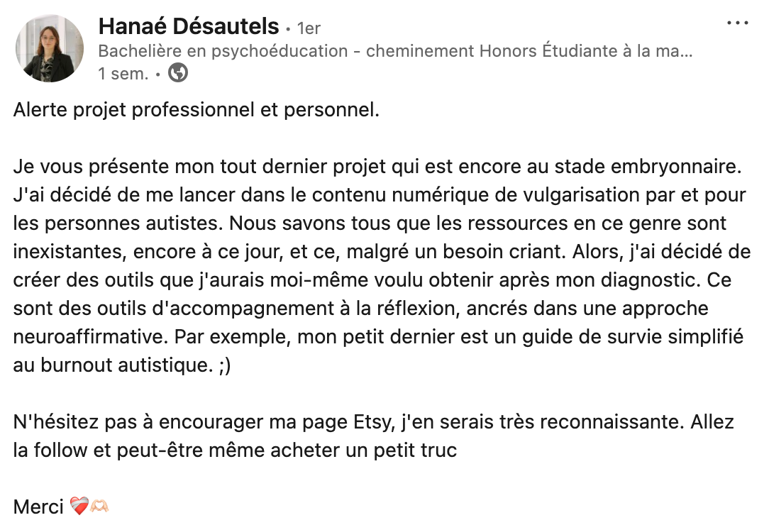 Je vous invite vivement à suire Hanaé sur LinkedIn pour demeurer à l’affût de ses projets à venir. Elle déborde d’idées et d’ambitions!